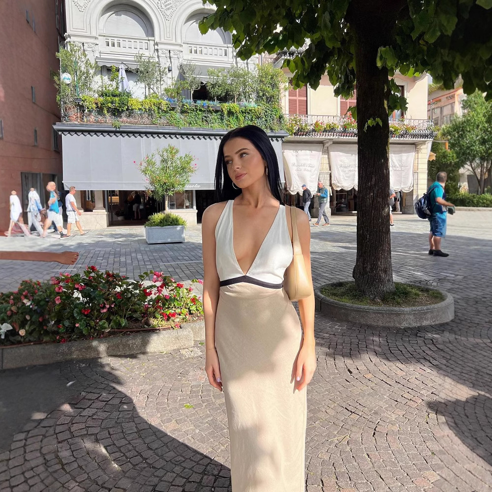 2025年夏の新型フランス式の甘辛風の後で背中を透かして腰を透かして色のセクシーなvネックのガーターのワンピースをつづり合わせます。