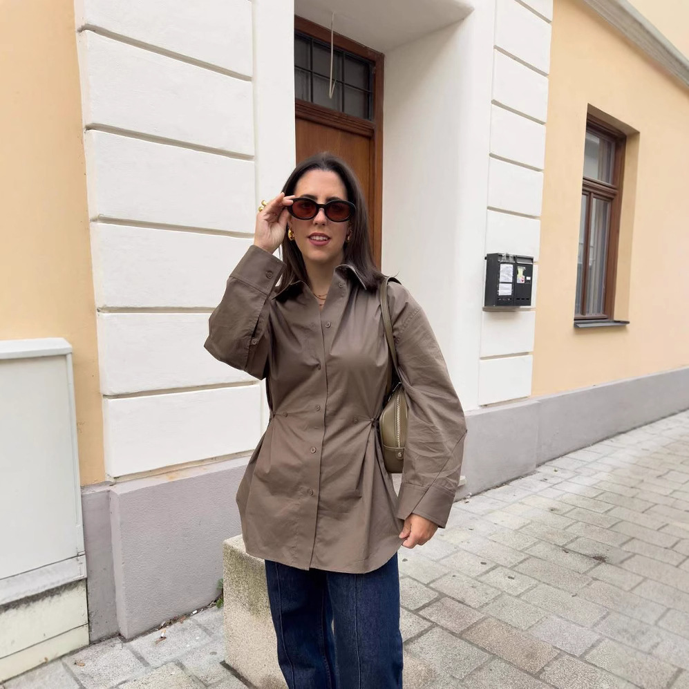 実際に純色の襟をたたいて腰の長袖のカジュアルな気質のシャツを収めます。