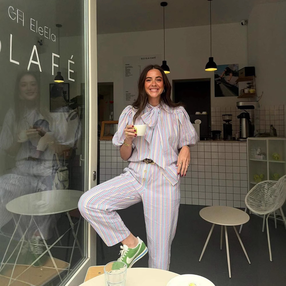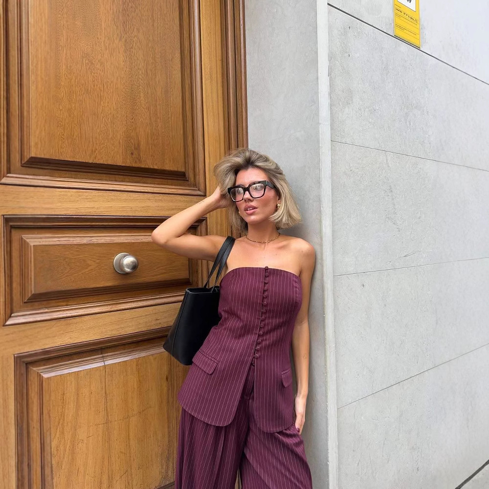街頭の実写国境を越えた欧米のフランス式の胸のストライプのスーツのストレートなズボンのファッションの気質の2024新型の婦人服