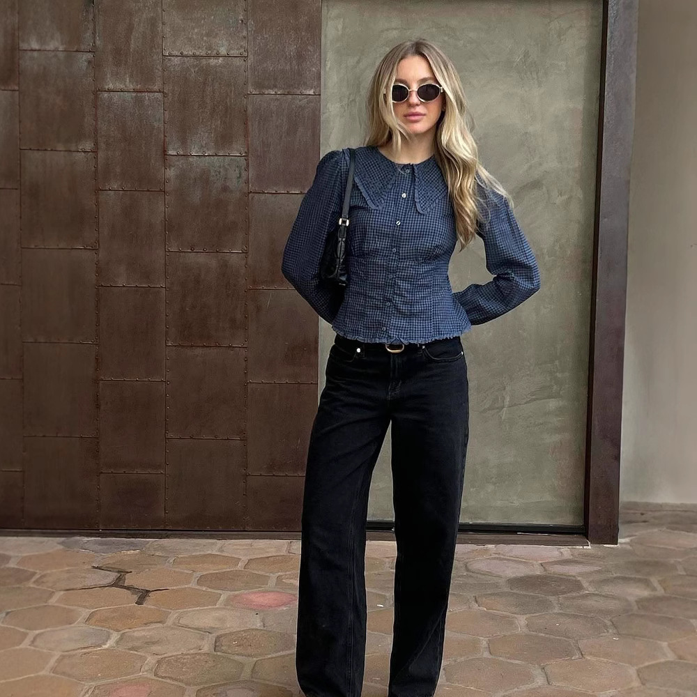 欧米の国境を越えたファッションフランスのレトロなマイクロラッパの襟の格子縞の長袖の短い服のシャツの熱い販売の婦人服