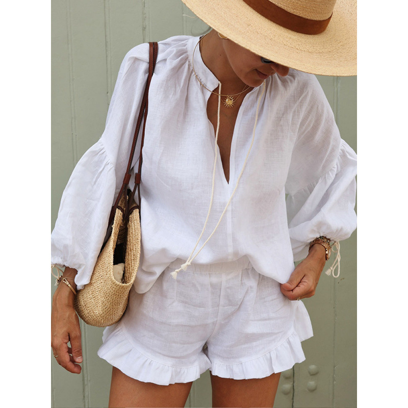 欧米のファッション綿麻の純色のゆったりしたvネックの灯籠の袖の半ズボンの2つのセットの夏の百合のストラップの高腰のスーツ