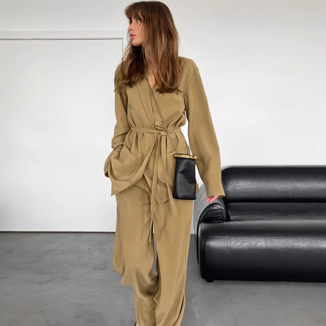 欧米の怠惰な風のカーキ色の上着のズボンの2つのセットの女性の小さい大衆のゆったりしている欧米のカジュアルなスーツの婦人服