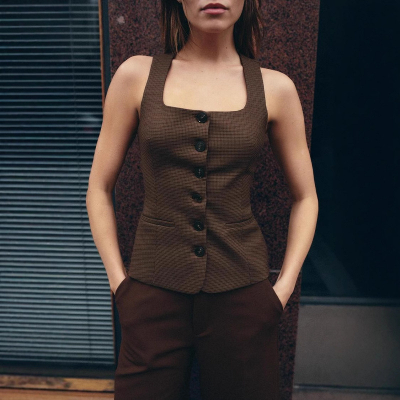 2024新型欧米の国境を越えた女性の格子の方襟の上着のセクシーな修身ボタンの袖なしのベストの婦人服