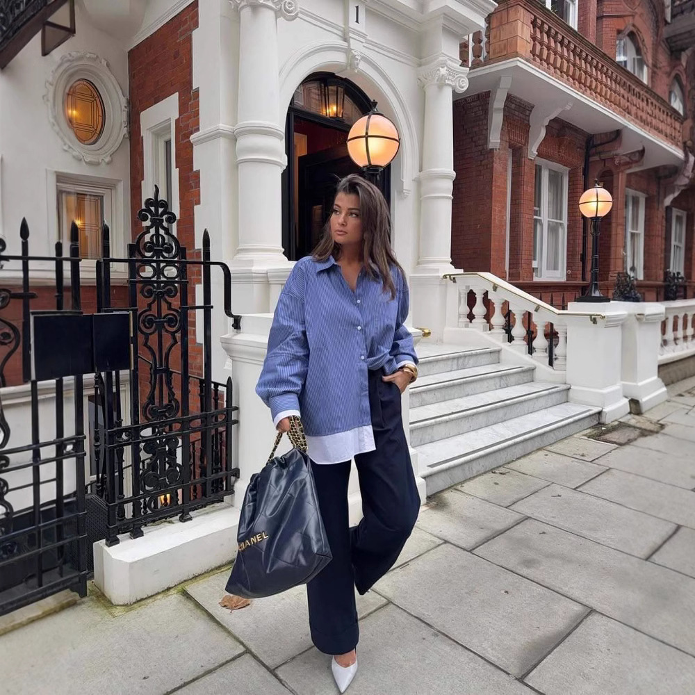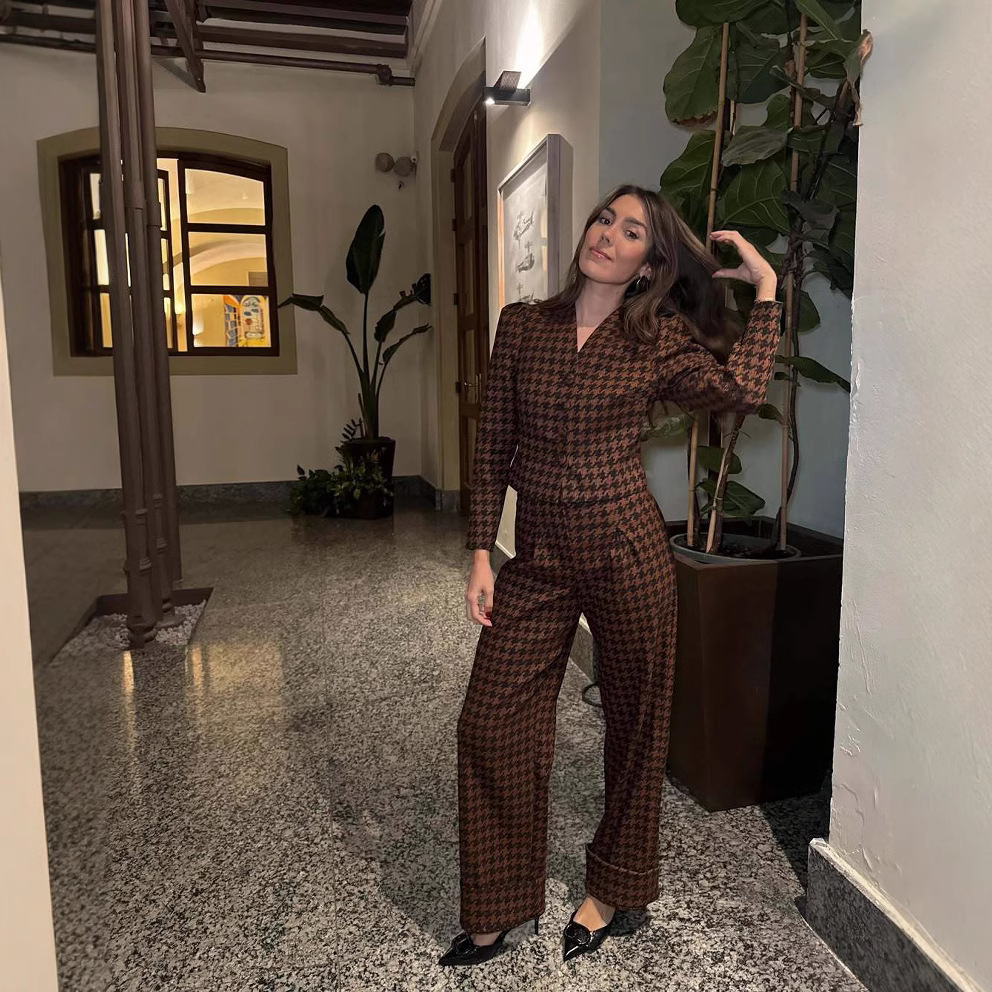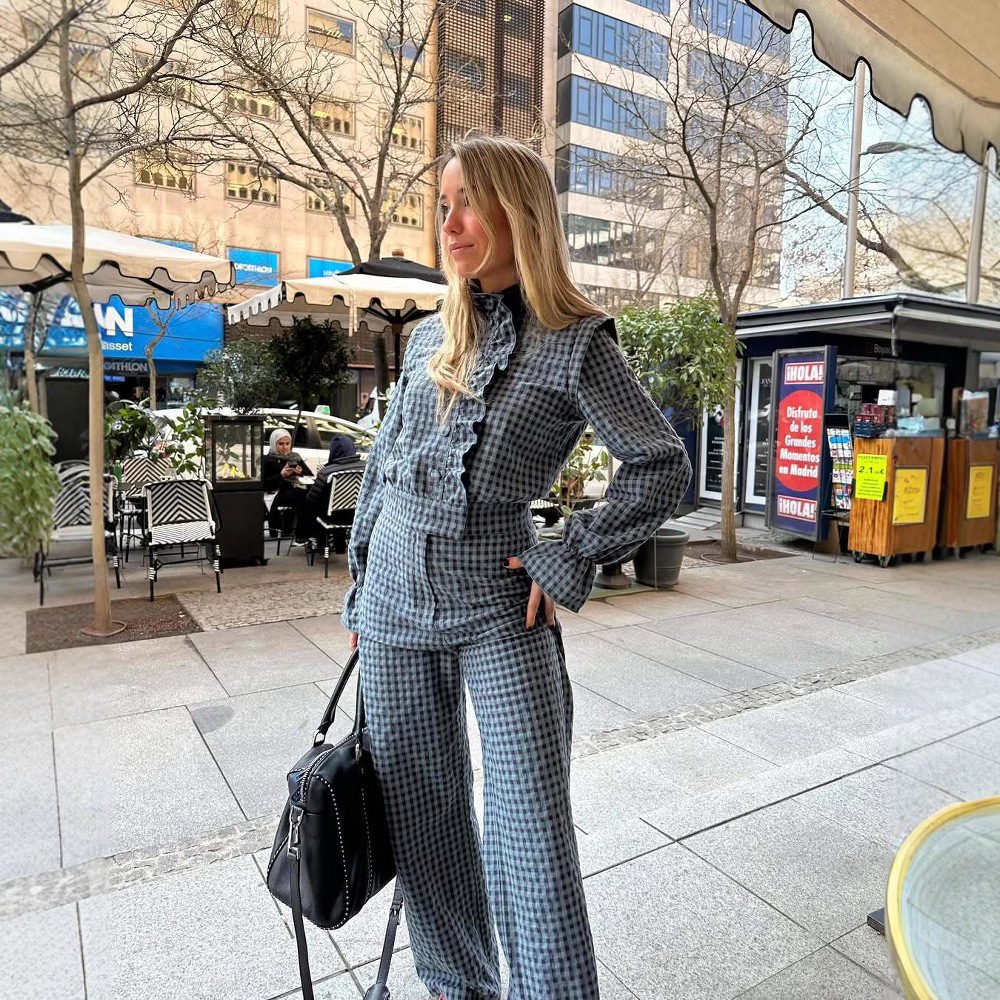フランス式宮廷風ブルー格子縞スーツ女性2024国境を越えた新しいレトロな立襟木耳シャツストレートパンツ