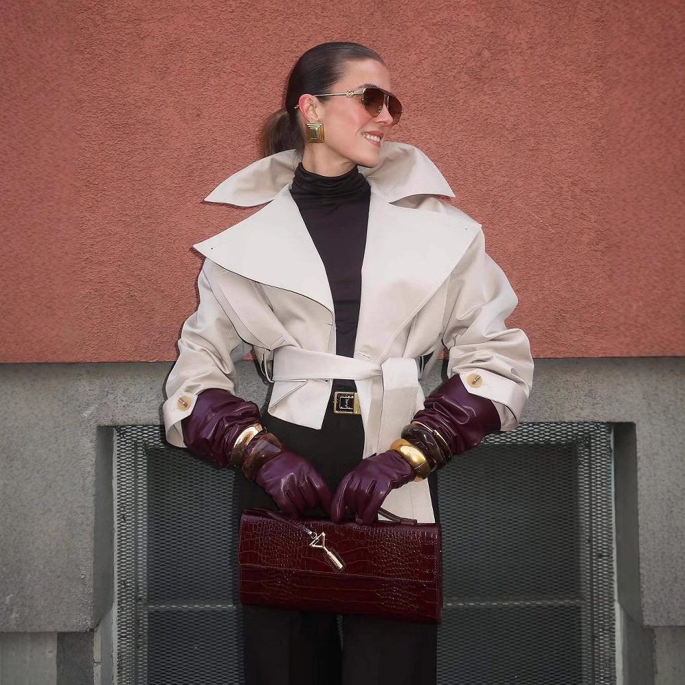 新商品の純色の襟をめくった長袖は短いスタイルのトレンチコートを持っています。