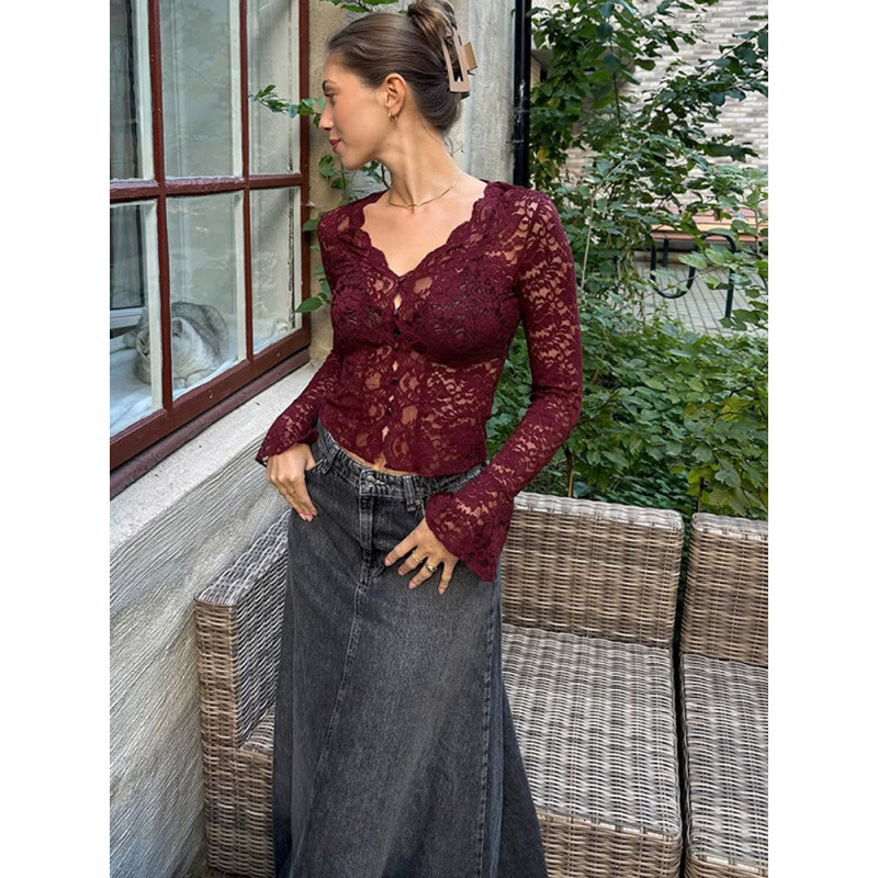 新しい長袖レースの上着欧米のクロスボーダーのレトロな修身のフランス式レースのvネックの長袖の底の上着のtシャツ