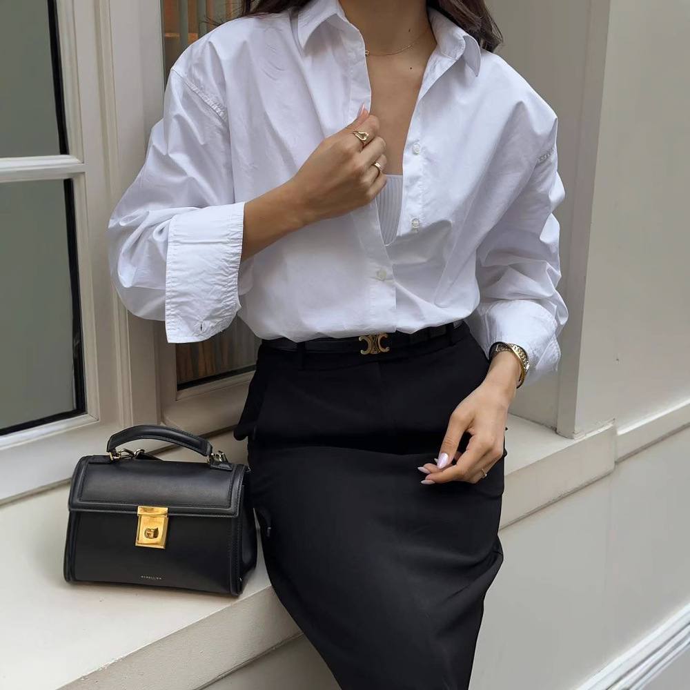 2024クロスボーダーの外国貿易の婦人服欧米の新型のファッションの気質のフランス式の襟をひっくり返して色の長袖のゆったりしているシャツをつづり合わせます。