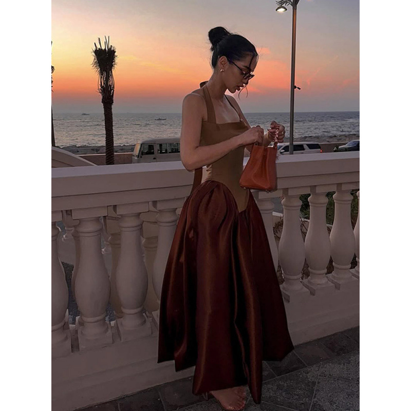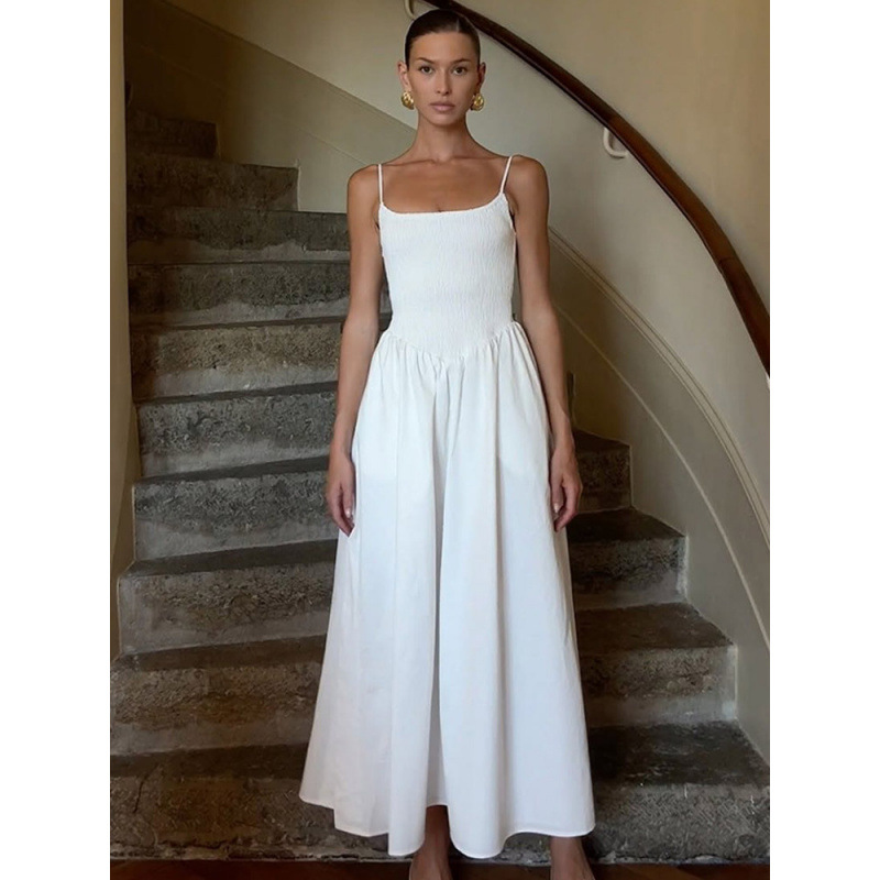 新型欧米対外貿易クロスボーダー婦人服夏一字肩ストラップ気質高腰傘スカートリゾート優雅ロングスカート