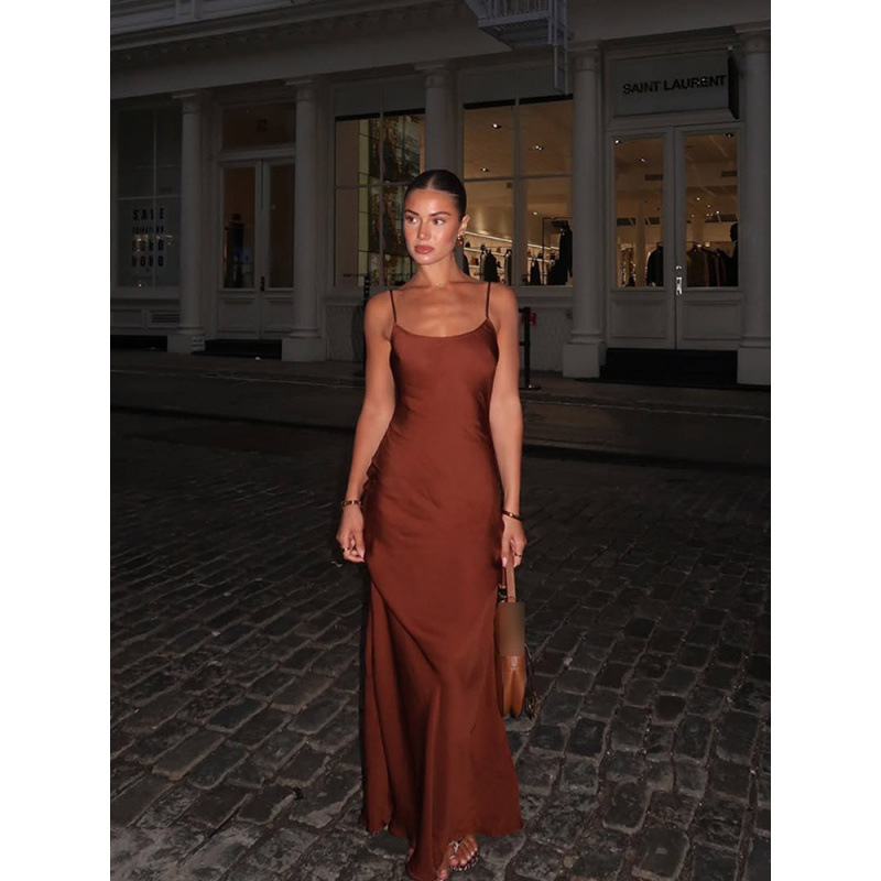 新しい純色ストラップのサテンのワンピースの肩の気質のセクシーな修身の婦人服のワンピースの2024欧米のクロスボーダー
