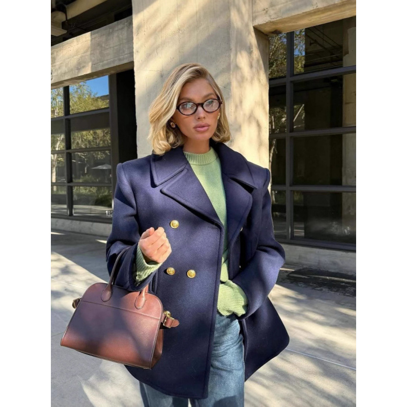 実際に新型の純色の襟をめくる長袖のラシャのコートのファッション的な気質の出勤する金のコートの2024欧米は国境を越えます。