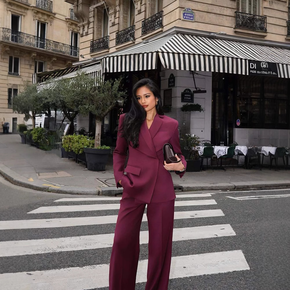 新商品の純色の襟をめくって長袖のスーツのコートのまっすぐな筒の広い足のズボンのカジュアルなファッションの気質の通勤スーツのクロスボーダー