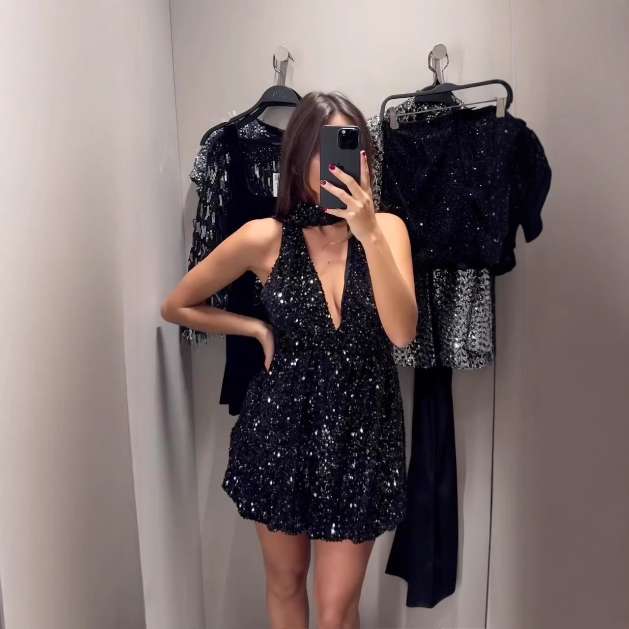 首を掛けてvネックの黒色のセクシーな短いワンピースの2024の新型のファッションの気質の欧米は国境を越えます。