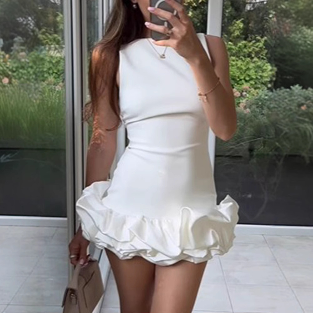 欧米のクロスボーダーの純色の丸首の袖なしの木の耳元のワンピースのスカートのファッション的なセクシーな腰を収めてお尻のミニスカートを包みます。
