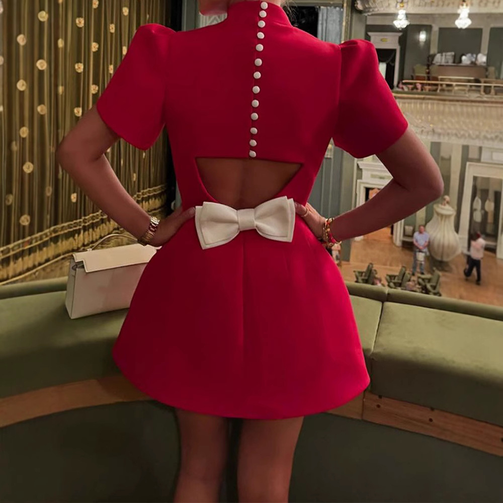 立襟半袖背中透かし彫り蝶結び飾りスカート欧米クロスボーダーファッション修身気質ミニワンピース