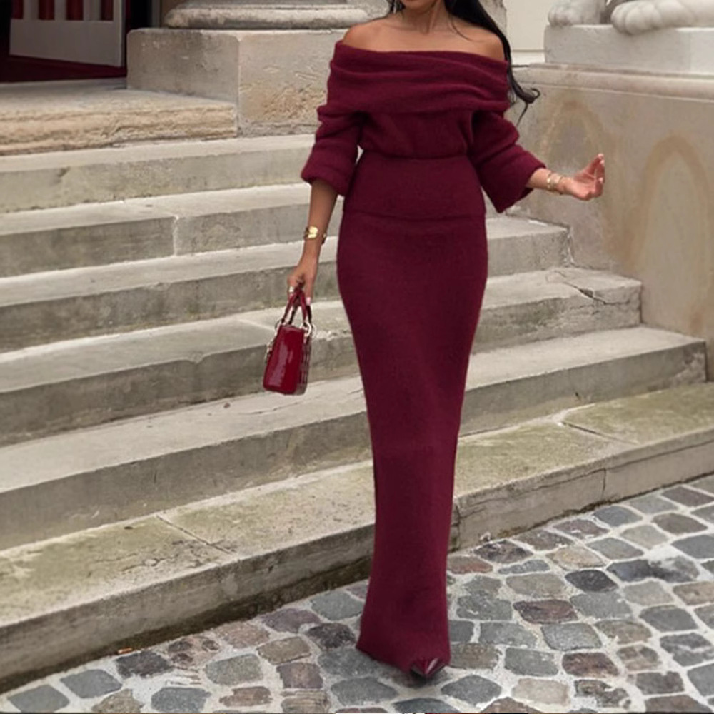 純色の肩のニットのロングスカート欧米の越境するファッションのセクシーな修身は目の気質のメリヤスのロングスカートのワンピースを吸います。