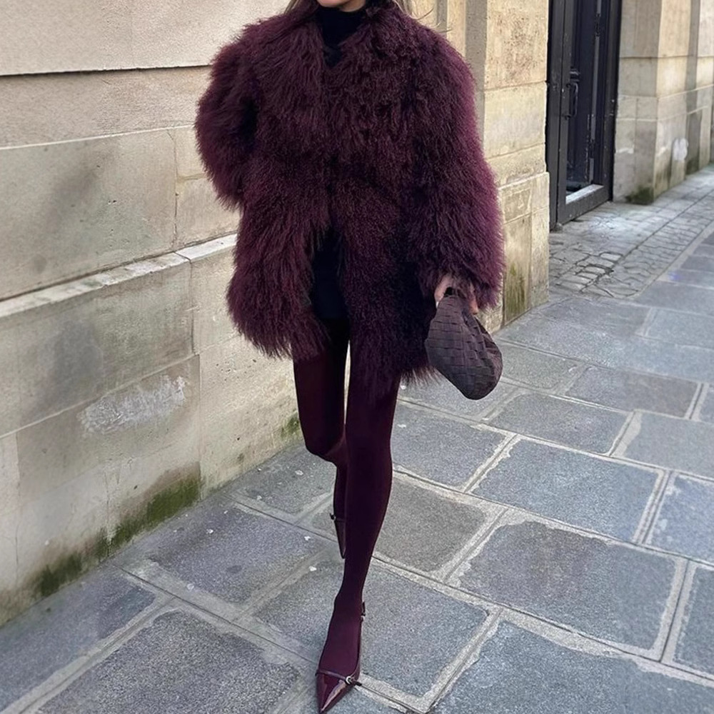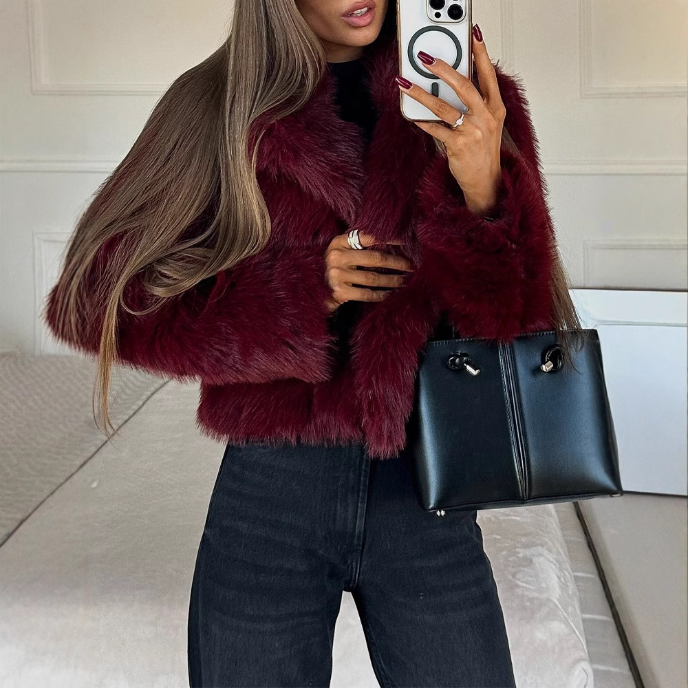 ワインレッドの短い襟の毛皮のコート2024欧米の国境を越えたファッションの優雅な冬のぬいぐるみのコート
