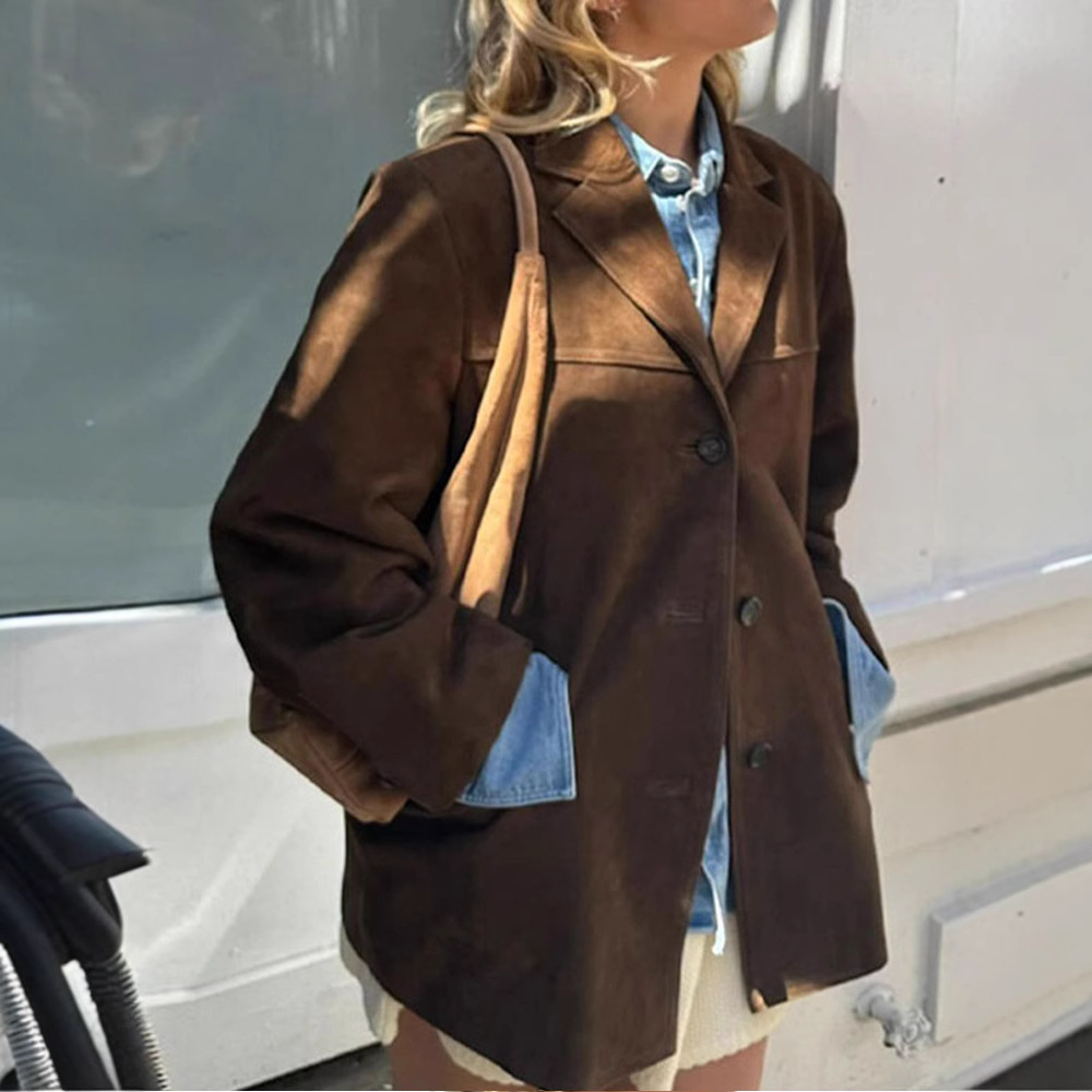 爆発的なレトロなカジュアルなアメリカの襟付き長袖ジャケット2024欧米の国境を越えた茶色のスエードのコートの上着
