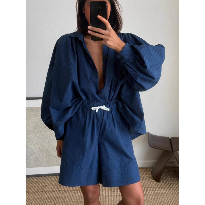 カジュアルルーズレースアップシングルブレストシャツショーツツーピースクロスボーダーブルーストライプランタンスリーブシャツセット
