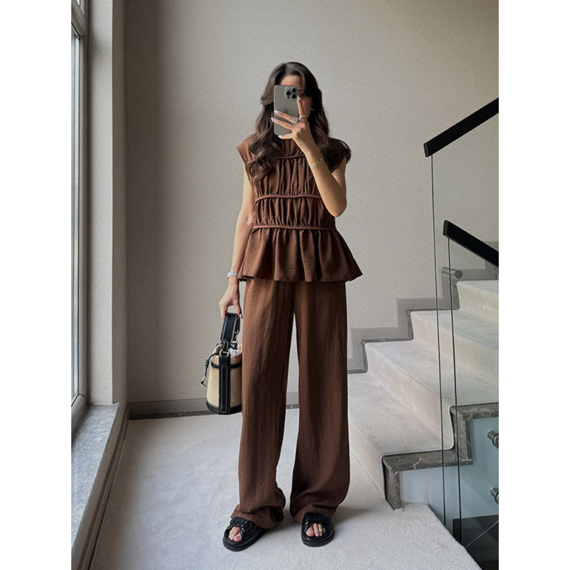 ヨーロッパとアメリカの貿易クロスボーダー 2025 AliExpress 新しい無地ノースリーブプリーツ弾性ウエストトップワイドレッグスーツ