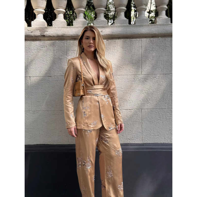 シルバーのスパンコール刺繍が施されたシャンパンサテンスーツ、ベルト付きクロスボーダー気質ストレートパンツ2点セット