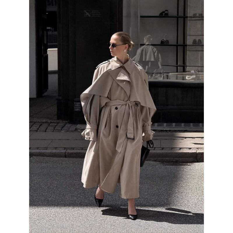 実物写真-カーキ色のロング丈ベルト付きゆったりケープ風コート2025年新作イギリス風クロスボーダーレディースウェア