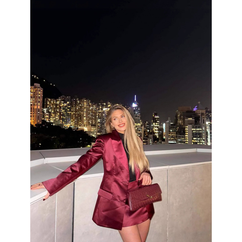バーガンディウエストサテンスーツハイウエストスカートツーピースクロスボーダーバーガンディレッドミニスカートスーツ