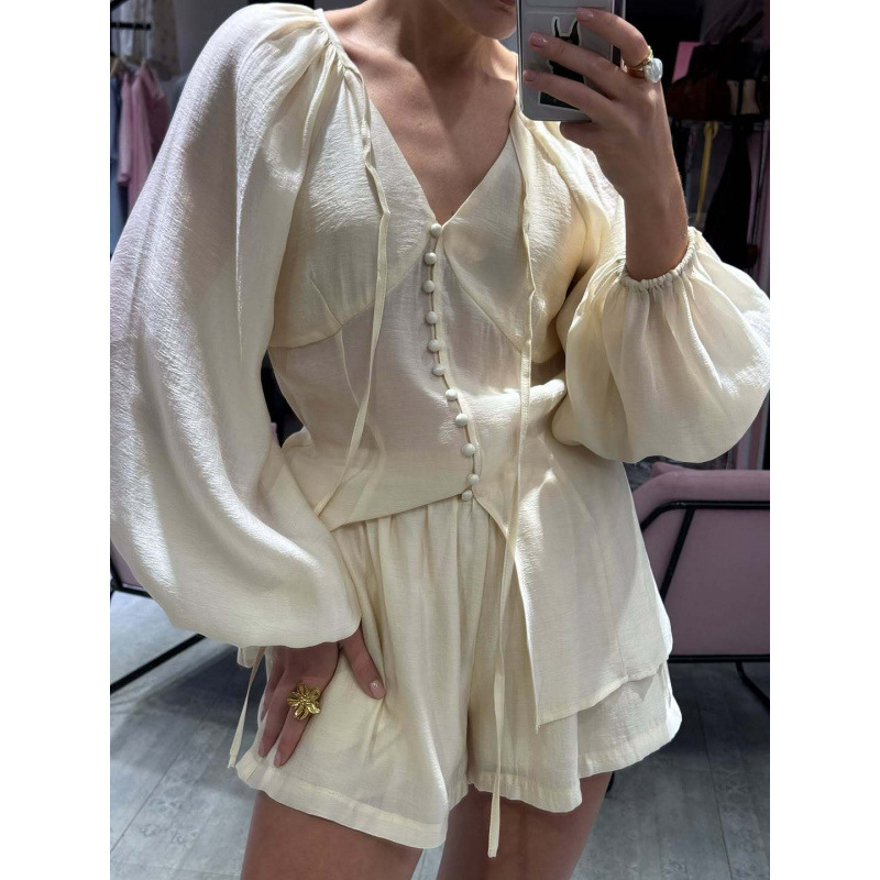 無地Vネックシングルブレストランタンスリーブスリムシャツハイウエストショーツスーツクロスボーダーヨーロッパとアメリカのエレガントな2点セット