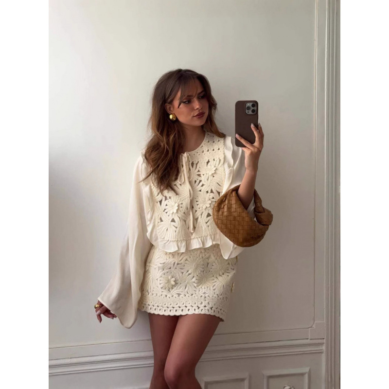 レースアップ中空ステッチラウンドネック長袖トップミニスカート休暇カジュアルツーピースセットクロスボーダーヨーロッパとアメリカの服