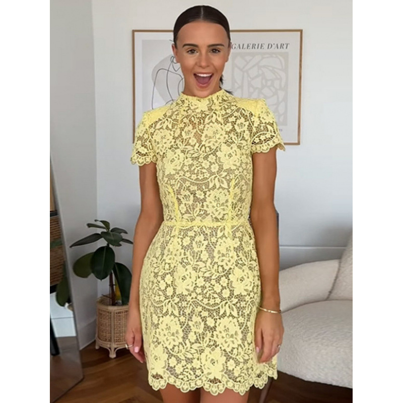 2025 クロスボーダーヨーロッパとアメリカの AliExpress ホットセールイエローエレガントなスリム半袖レースヒップカバーミニドレス