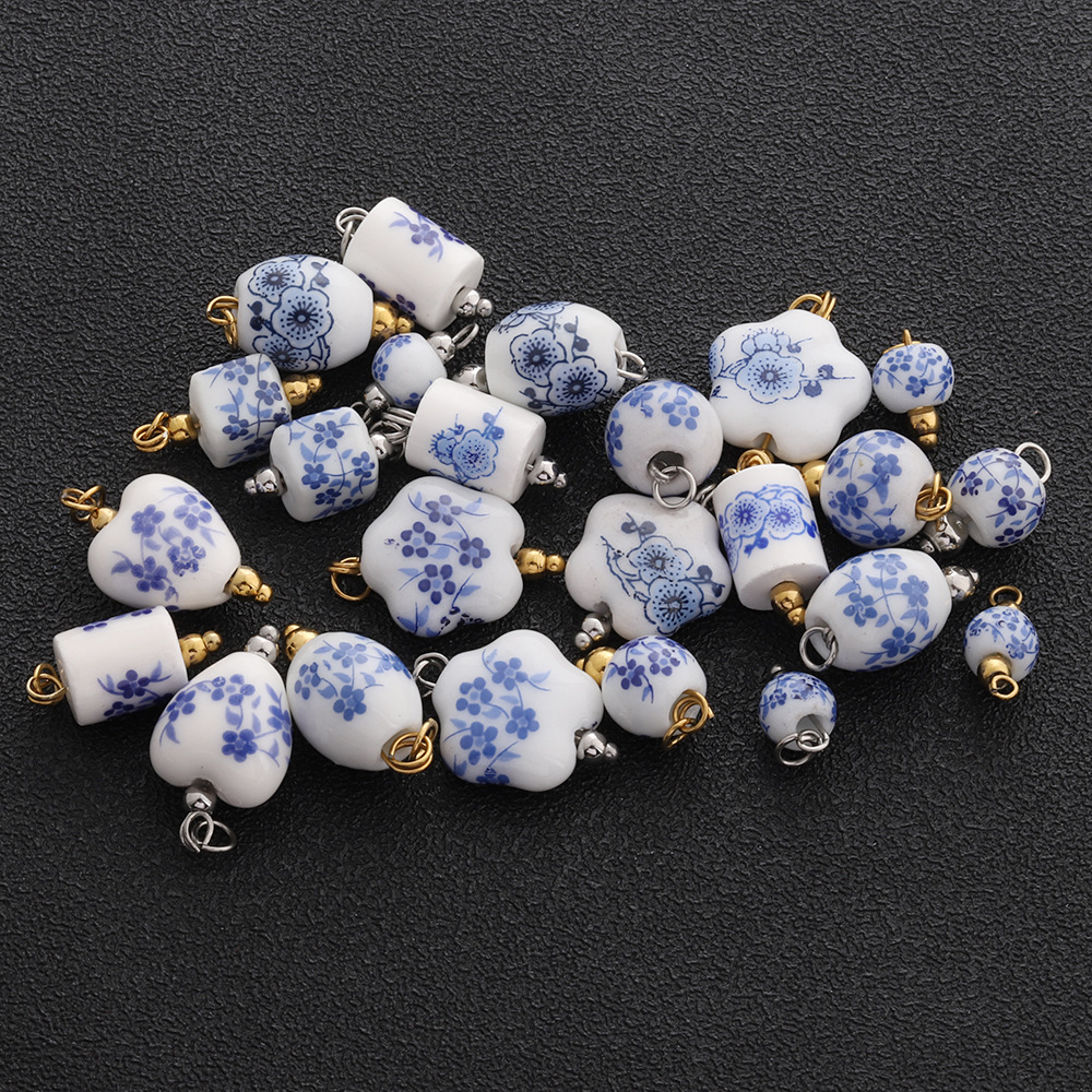 新しい中国風青花磁器ビーズ幾何学手作りペンダントステンレス部品ペンダントペンダント装飾服飾材料