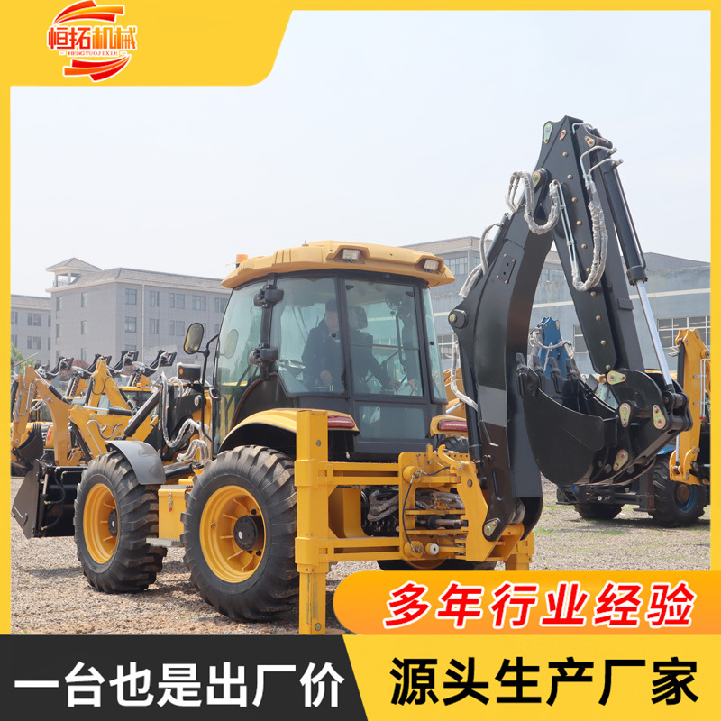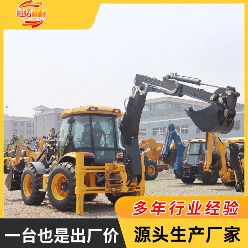 掘削機多機能建築工事農地果樹園の前シャベル後にホイールを掘るのが忙しい