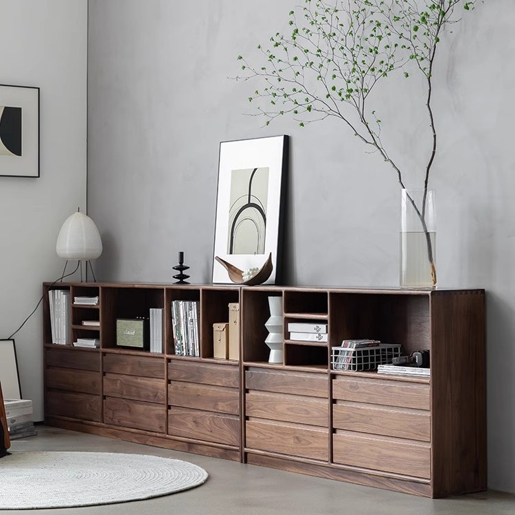現代シンプルな全実木本棚日本式黒胡桃木組み合わせ格子キャビネット床置き収納キャビネット低い本棚