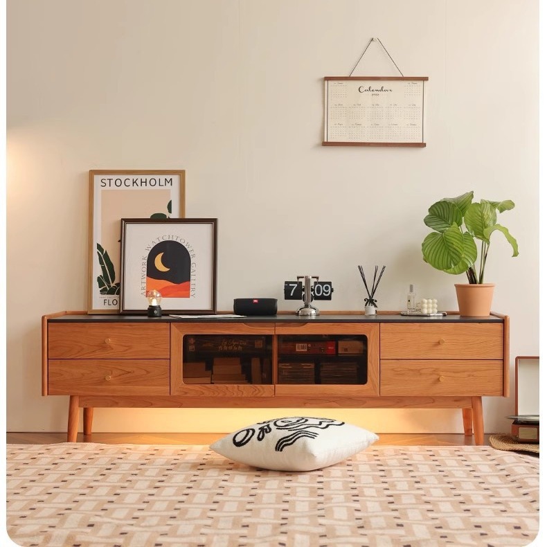 北欧シンプルな黒胡桃木全実木岩板テレビキャビネット小戸型桜桃木リビングテレビキャビネットライト付き