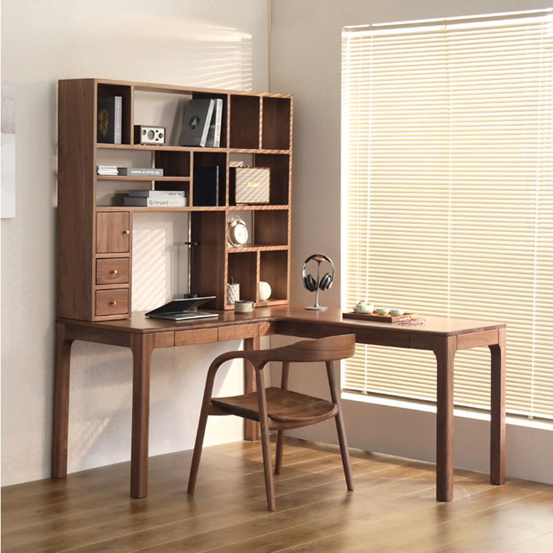 北米黒胡桃木全実木机本棚一体テーブルセット角L型桜木コンピュータデスク