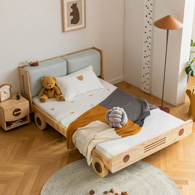 北欧の全実木の白いワックスの木の子供のベッドの男の子の漫画の自動車のベッドのシングルベッドの寝室の青少年の柔らかいベッド