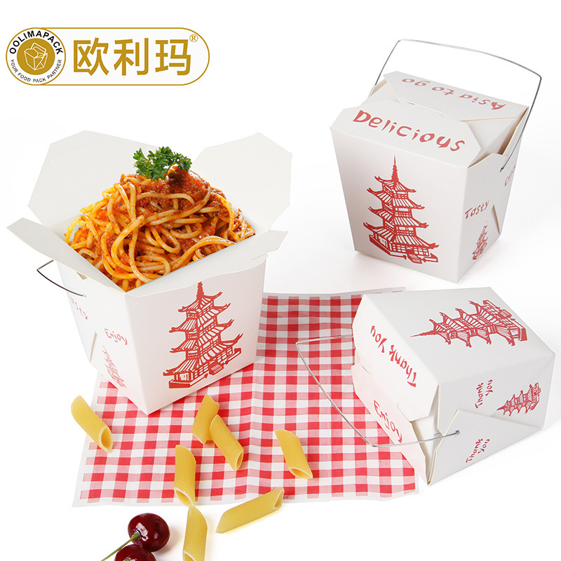 Olima レッドタワー鉄ハンドルポータブルパスタ包装紙箱使い捨てスナックファーストフード弁当箱 100 個ホット販売