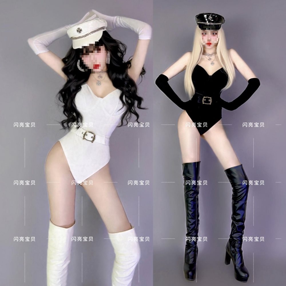 新しいセクシーなバーゴーゴーホワイトサスペンダーワンピースショー雰囲気グループリードダンススーツdsネイビースタイルパフォーマンススーツ