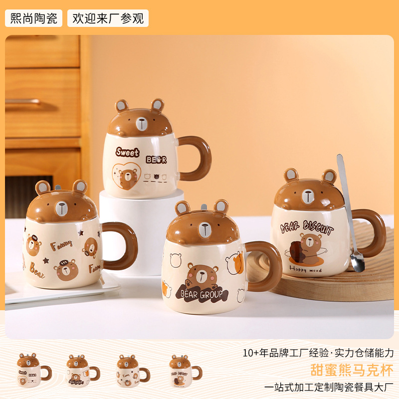 創意的な熊の陶磁器のマグカップは蓋とスプーンの漫画の個性を持ってコップを飲みます。