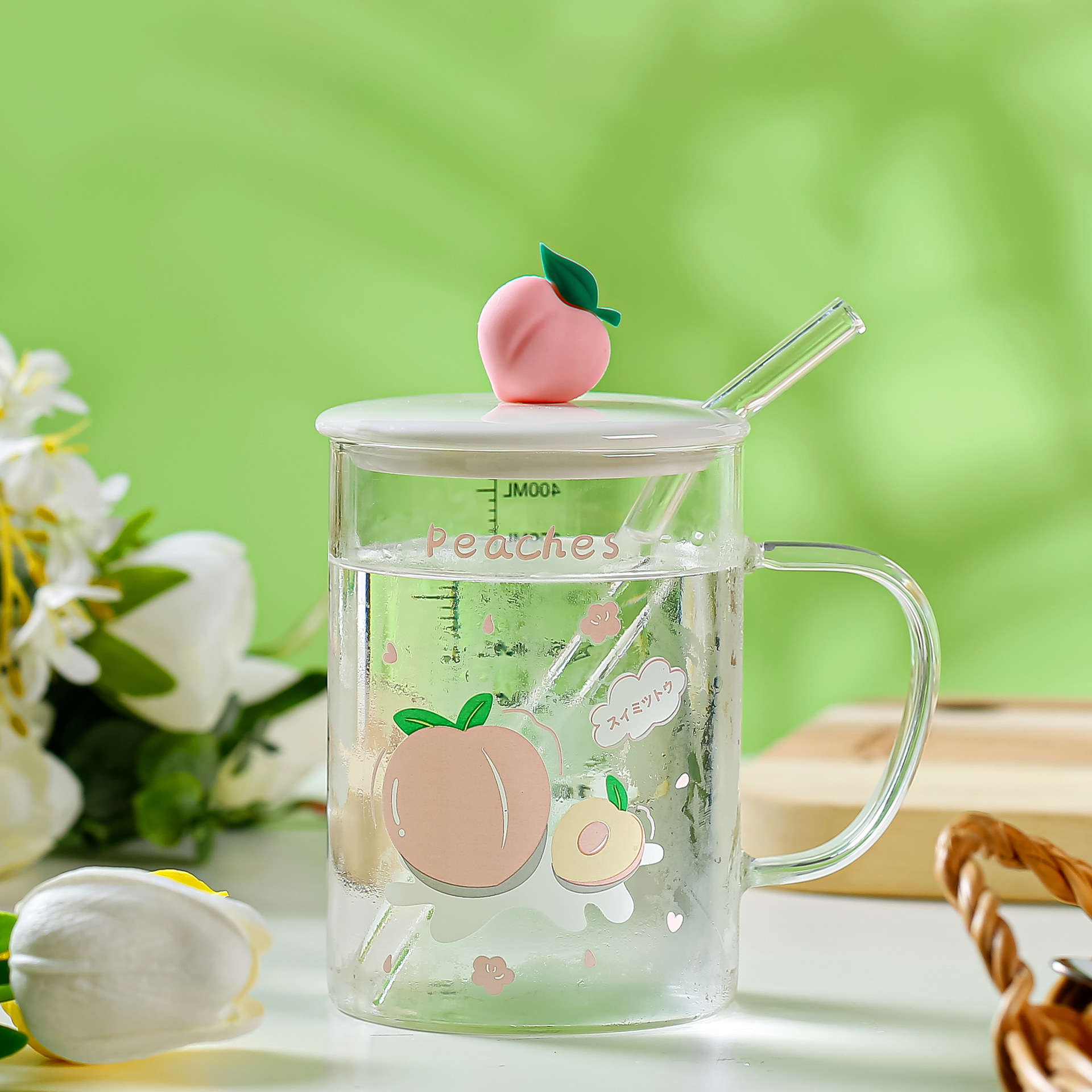 かわいいデザインのガラス製フルーツテーマの大容量透明カップ、蓋とガラス製ストロー付き、百貨店のギフトやドリンクに最適