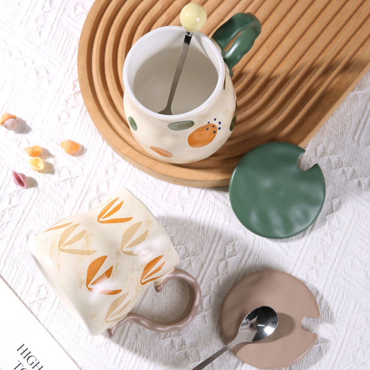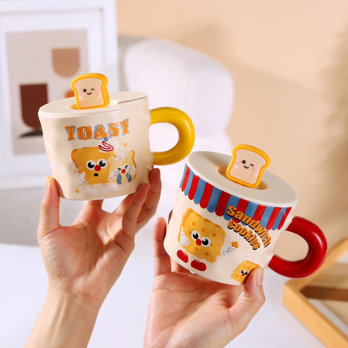 かわいいトーストエンドウ豆漫画マグカップ蓋付きセラミックカップ女子学生高颜値オフィスカップ牛乳カップ