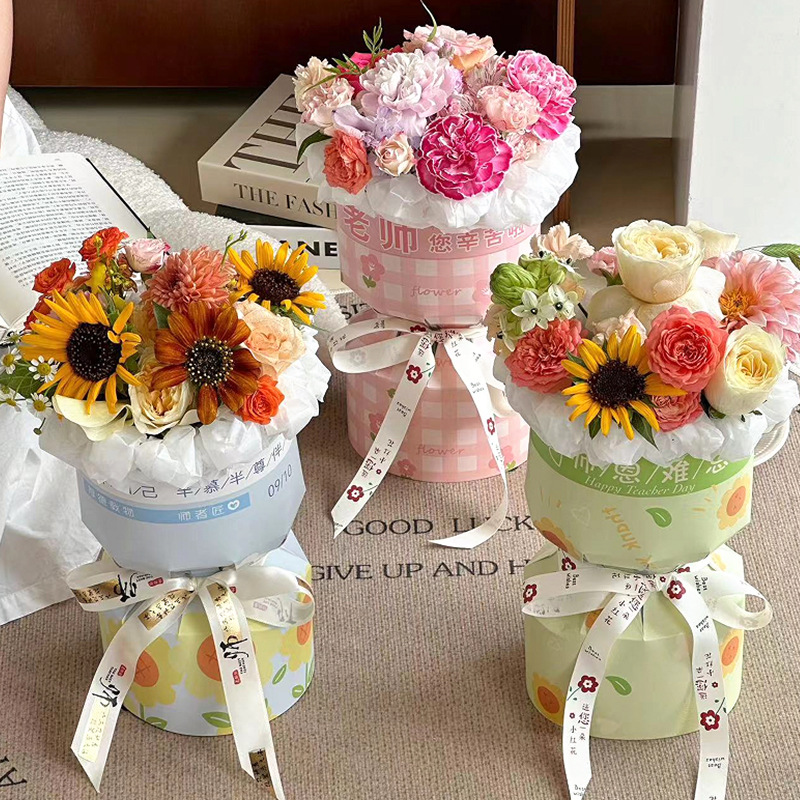昌易卸売 教師の日用一体型包装成形カード 円筒形内張りひまわりバラフラワーアレンジメント素材