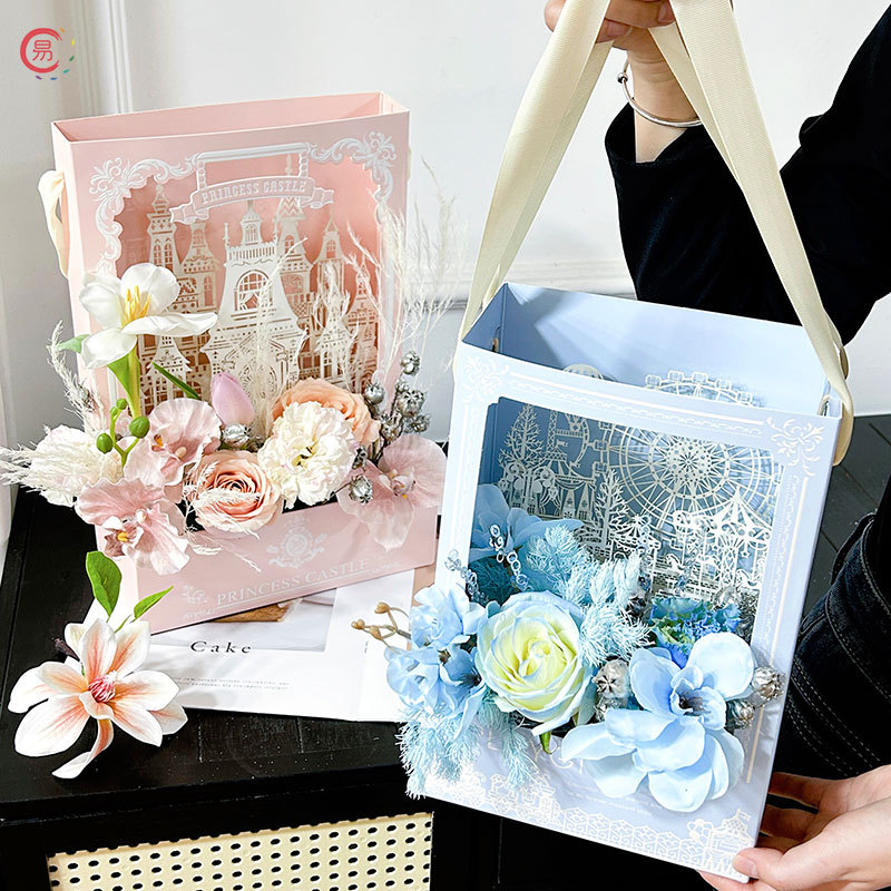 昌易卸売 童話彫刻箱 バレンタインデー 城型観覧車 花束 花アレンジメント ハンドバッグ型ギフトボックス フラワーアート