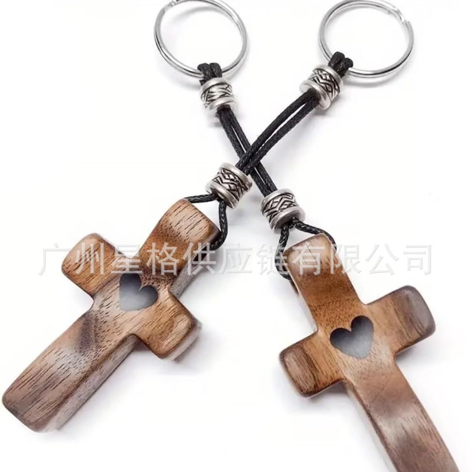 Artisanal wal心ウッドクロスキーチェーン胡桃木愛十字架キーホルダー