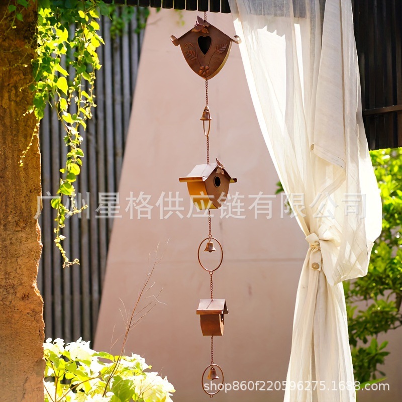 ヴィンテージBird House with Bellレインチェーンガーデンアウトドア庭レトロ雨チェーン