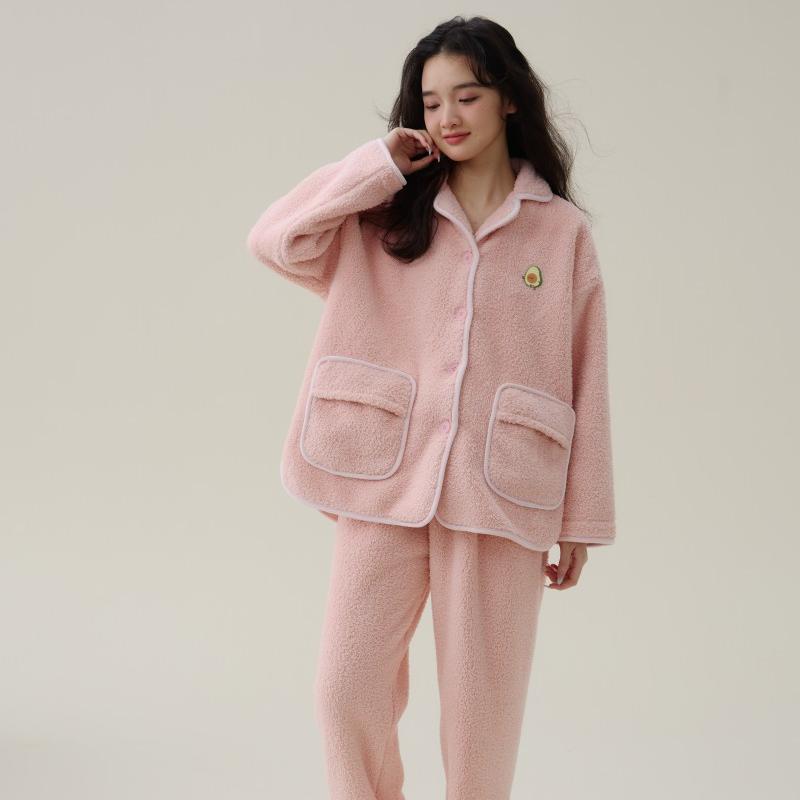 現物秋冬コーラルベルベットのパジャマセットの女性は、複合子羊のベルベットの二重丸襟の冬の家庭服を厚くした