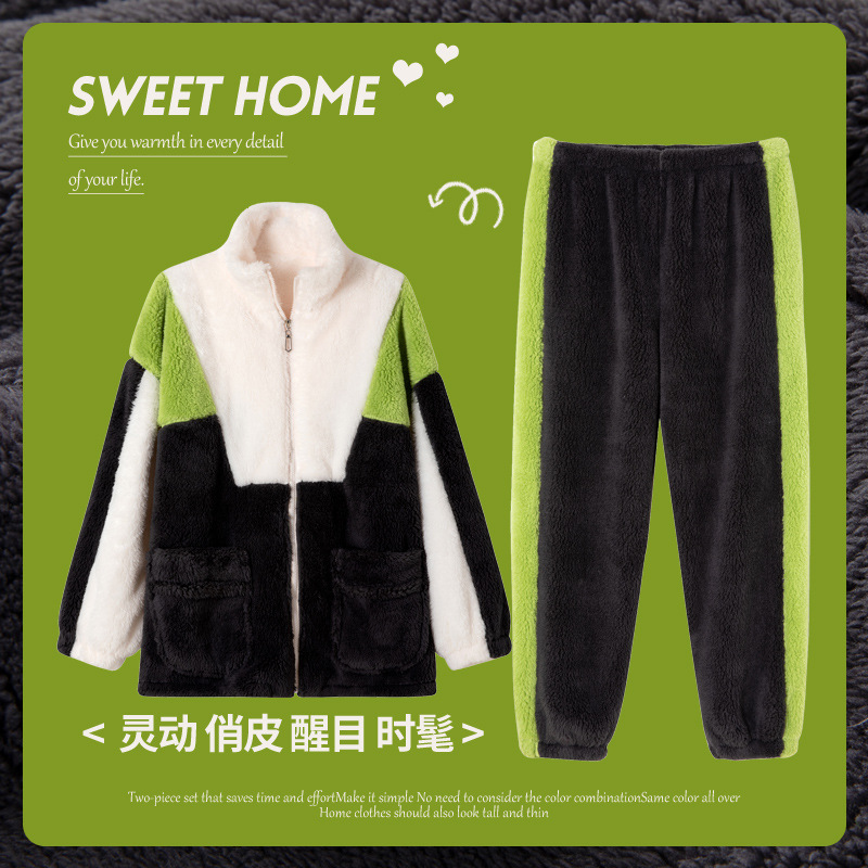 現物カップルパジャマ女性用冬にコーラルベルベットの家庭服男性秋フランネルのジッパーセットを厚くする