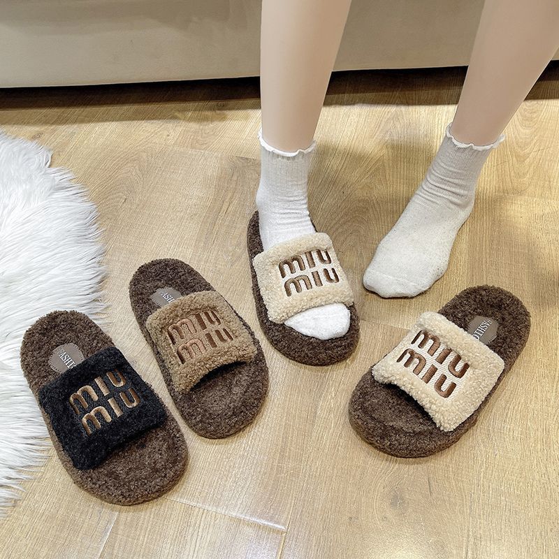 子羊の毛のスリッパの女性は2024の新型秋冬の爆発的な春夏の厚い底のネットの赤い家の1字の綿のスリッパを着ます。