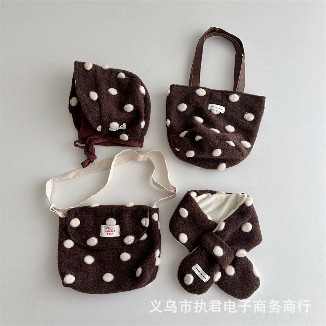 赤ちゃんの可愛い保温クロスマフラー韓国版ins子供の丸い点の半毛玉の帽子とリュックサックの手提げ