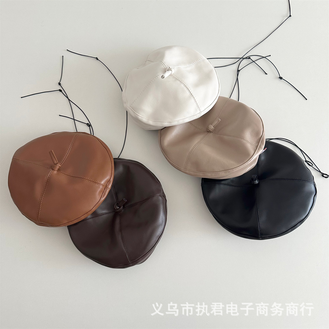 男女3-6洋気純色pu皮画家帽子韓系レトロな凹形と子供ファッションのベレー帽