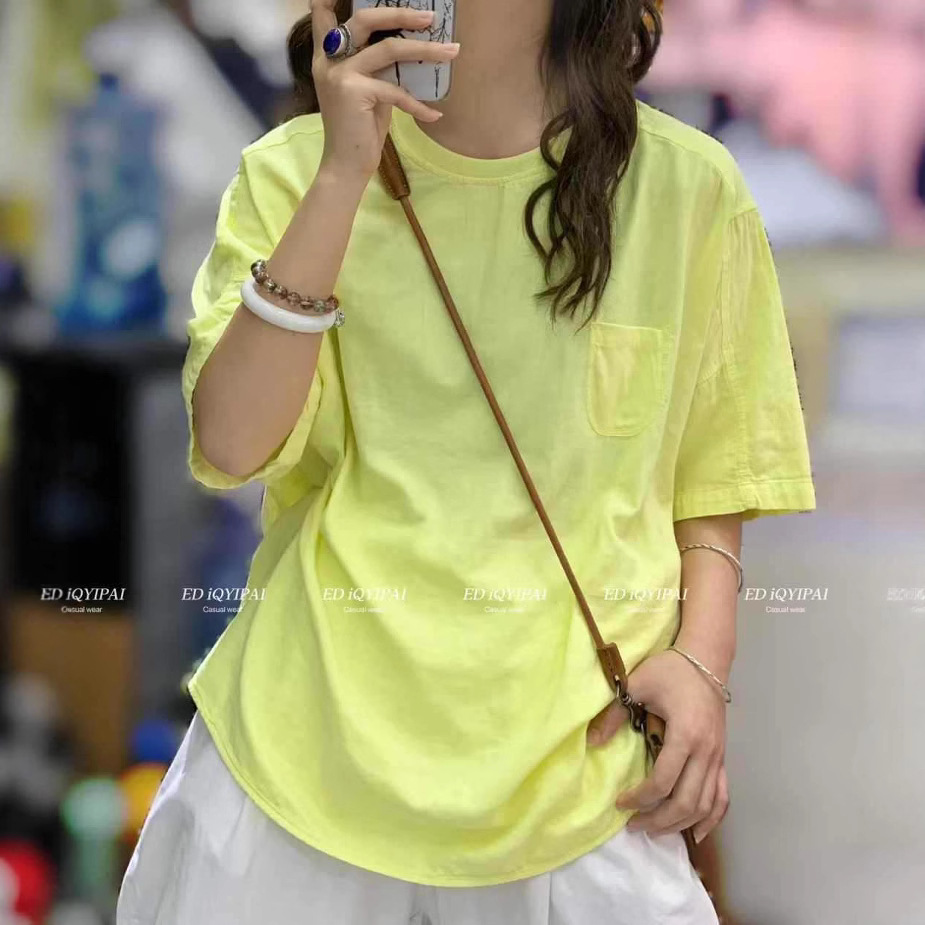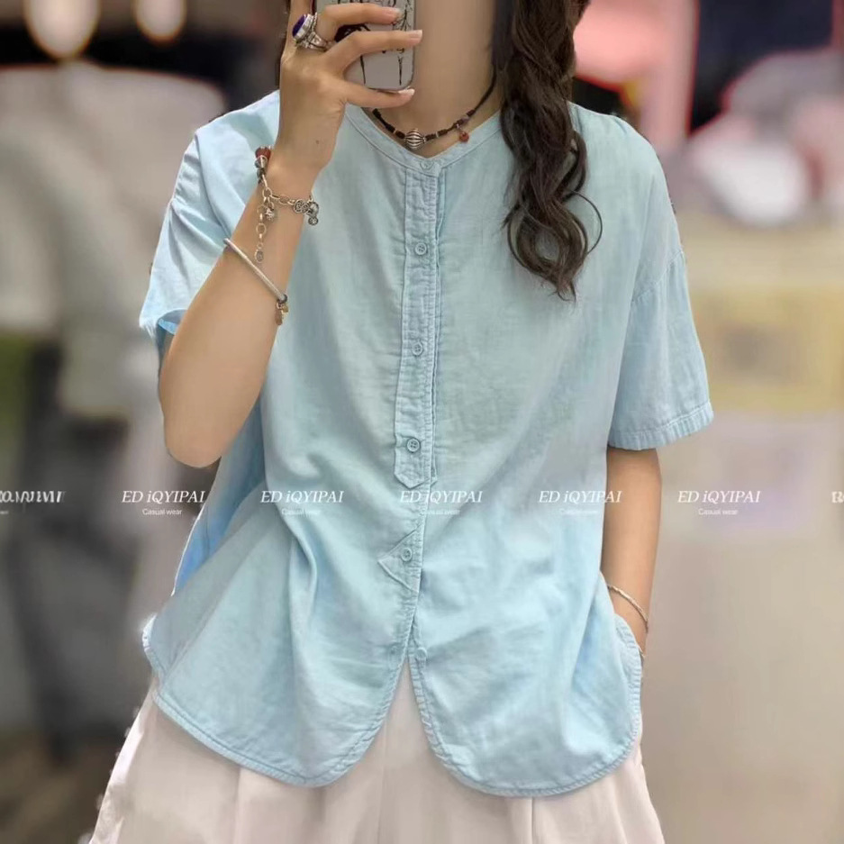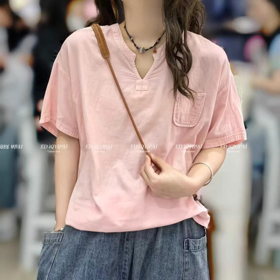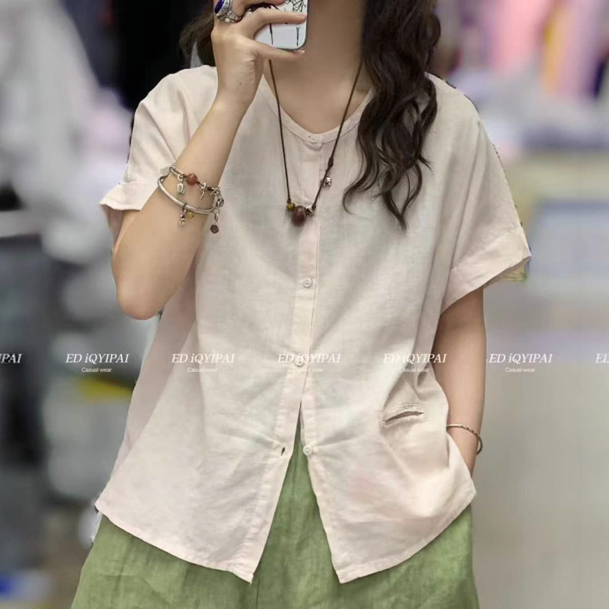 Ed7435綿麻ハサミ襟ゆるい半袖tシャツ2025夏の新商品百合痩せカジュアルプルオーバー女性
